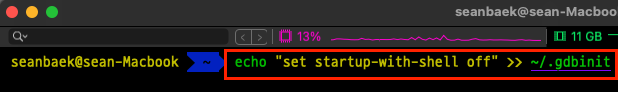 아래의 명령어에서 <gdbPath> 부분에는 자신의 MacOS에서 GDB가 설치된 경로를 입력해 줍니다.