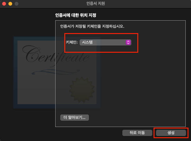 아래의 사진과 같이 인증서 위치 지정 부분이 나오면 사진의 내용과 같이 '시스템'으로 바꾸고 생성을 눌러줍니다.