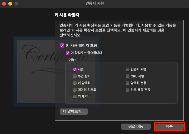 아래의 사진처럼 '이 인증서 사용 시' 항목이 있습니다.