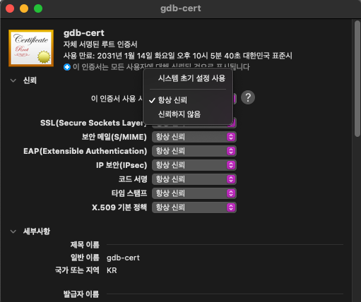 이 항목의 값을 '항상 신뢰'로 변경한 뒤 '정보 가져오기' 창을 끔으로써 해당 인증서를 항상 신뢰할 수 있도록 해줍니다.