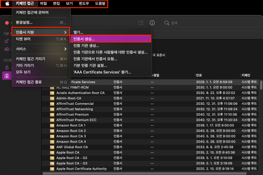 메뉴바 -> 키체인 접근 -> 인증서 지원 -> 인증서 생성...