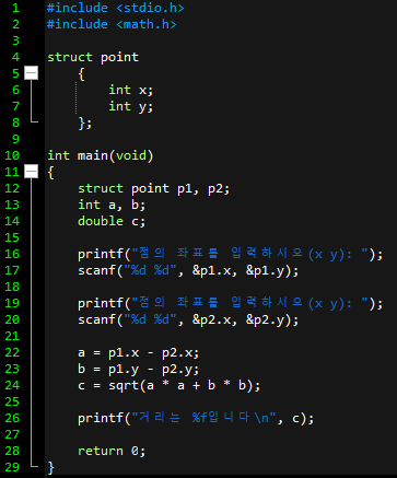 16 ~ 17번째 줄 : 사용자로부터 점의 좌표 값을 입력받아
