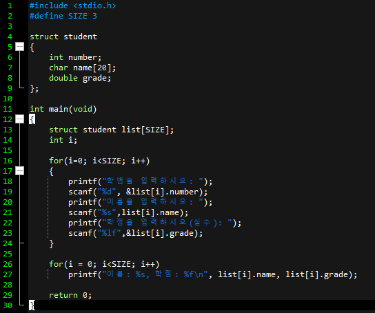 13번째 줄 : 구조체 student의 배열 list가 선언된다.
