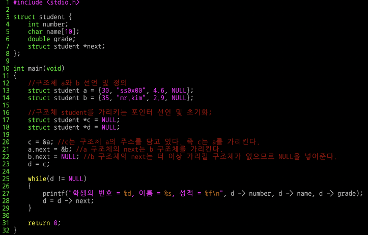 즉, c의 주소에 먼저 접근한 뒤 멤버 변수 next를 찾아 다음 구조체의 주소를 얻고,