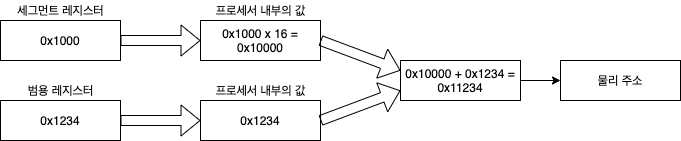 세그먼트의 기준 주소 + 범용 레지스터의 값(또는 상수 값) = 물리 주소