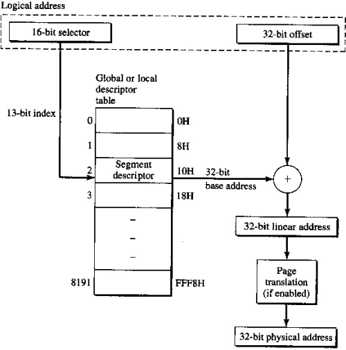 보호 모드에서도 물리 주소를 구하는 과정에서 리얼 모드에서와 같이 세그먼트의 기준 주소 + 범용 레지스터의 값(또는 상수 값)을 더해 계산하지만