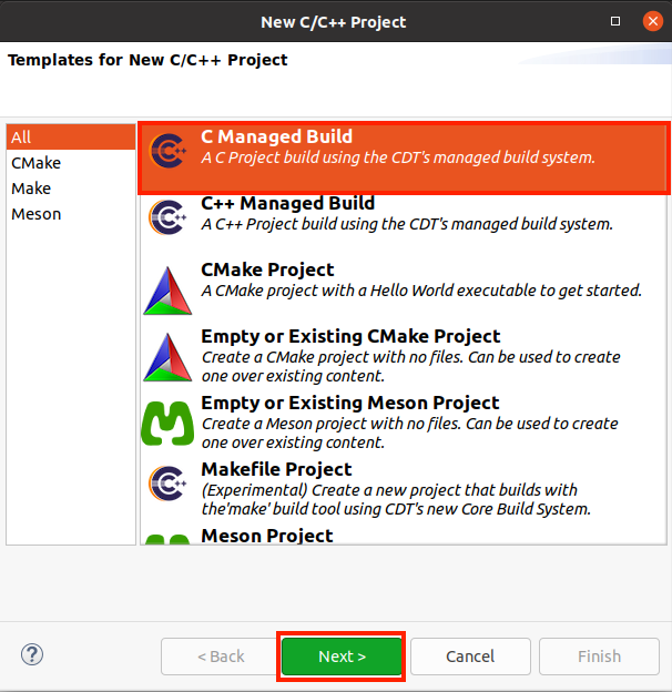 만약 아래의 두번 째 사진과 같은 화면이 뜬다면 C Managed Build를 선택하고 Next를 눌러줍니다.