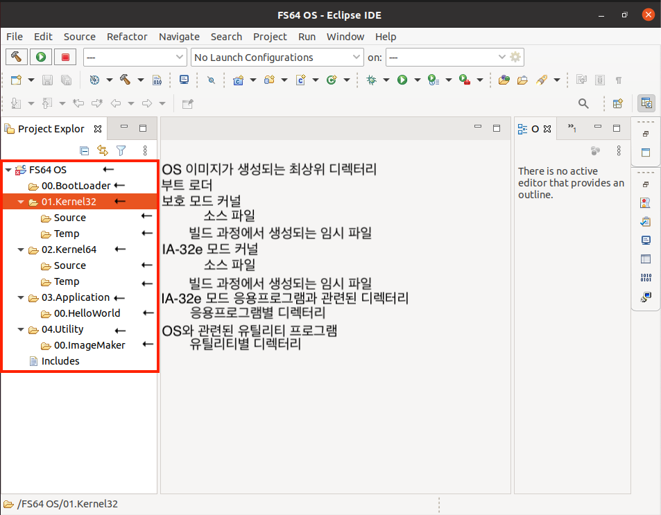 저는 Eclipse의 기본 디렉터리가 /home/sean/FS64 OS이고 해당 디렉터리 안에 FS64 OS라는 이름의 프로젝트 디렉터리를 생성했습니다.