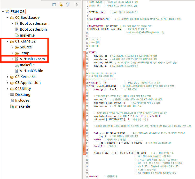 NASM 전처리기는 매크로(Macro), 조건(Condition), 반복(Loop) 구문을 지원하고, 변수 할당과 값 지정도 가능하기 때문에 이러한 구문을 잘 활용하면 숫자를 변경하는 것만으로 가상 OS 이미지의 크기를 변경할 수 있다는 점을 이용하여 1024섹터나 되는 코드를 작성합니다.