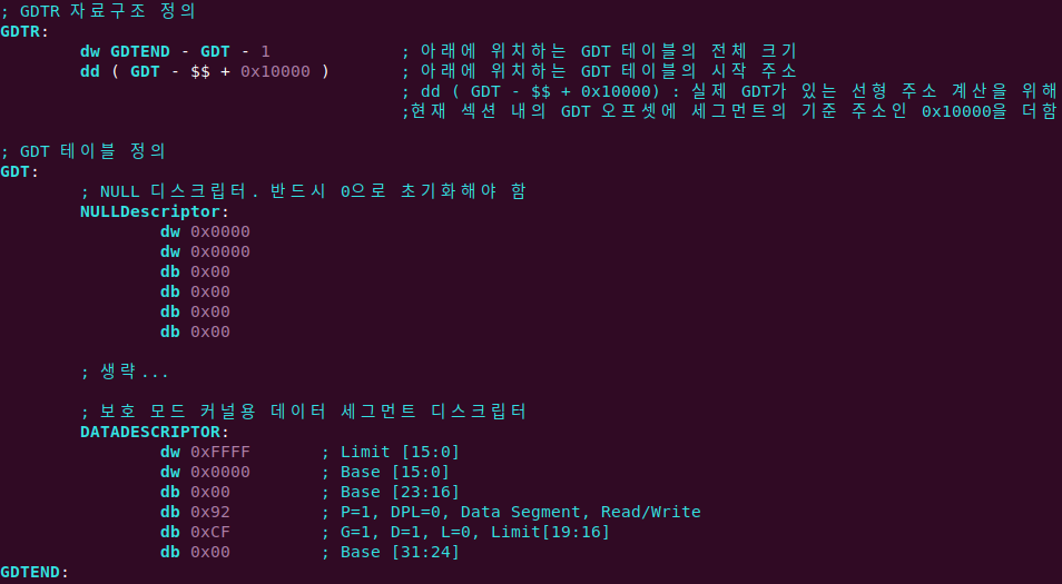 앞에서 세그먼트 디스크립터를 생성했으므로, NULL 디스크립터와 GDT 정보를 저장하는 자료구조만 앞뒤로 추가하여 어셈블리어 코드를 작성하면 됩니다.