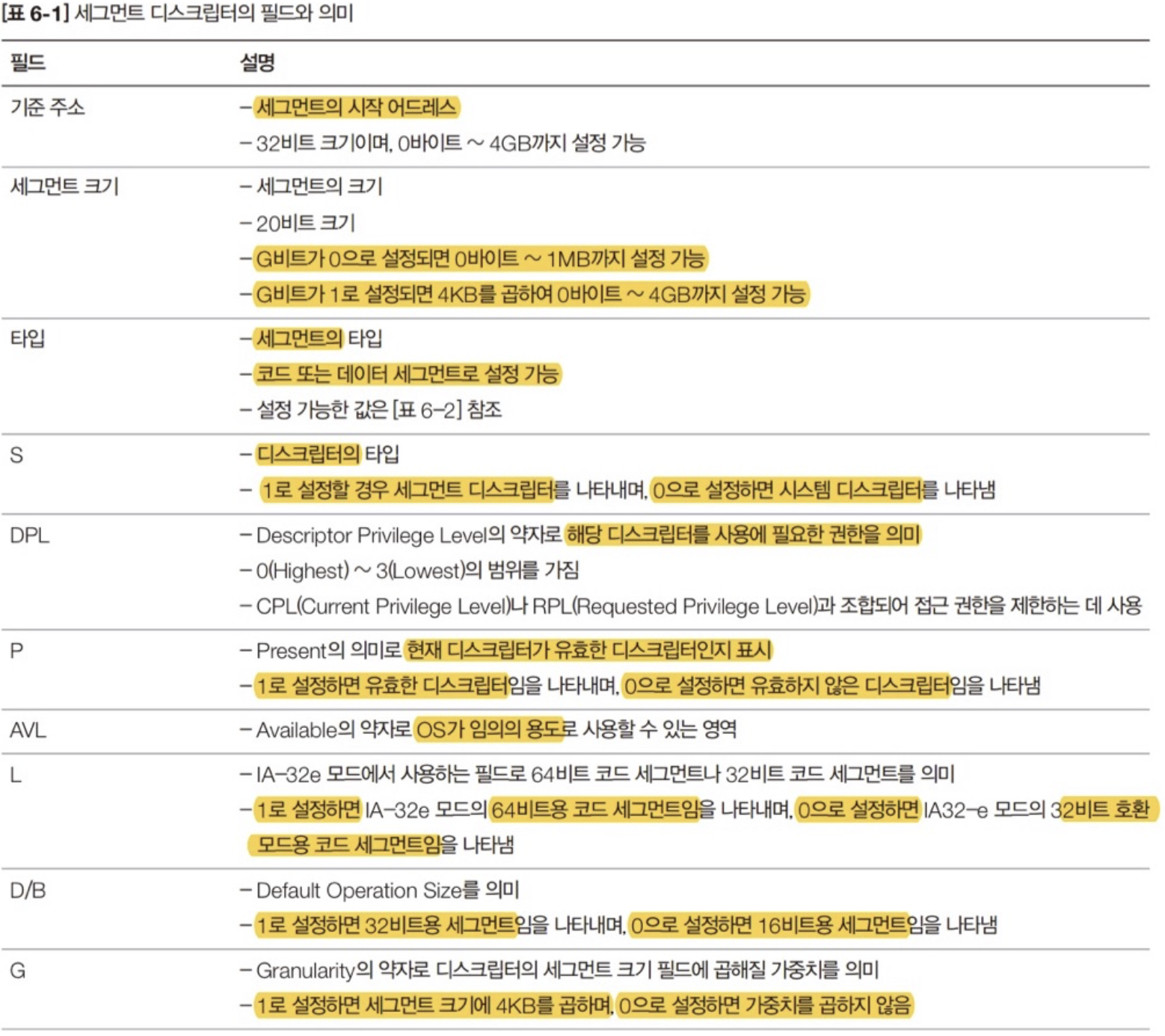 아래의 정리를 참고하면 디스크립터의 전체 값은 아니더라도 세그먼트 디스크립터의 몇몇 필드 값을 대략 유추할 수 있습니다.