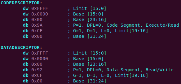 각 필드의 값을 토대로 코드 세그먼트 디스크립터와 데이터 세그먼트 디스크립터를 생성하는 실제 어셈블리어 코드는 아래와 같습니다.
