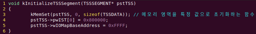 아래는 I/O 맵을 사용하지 않고, 7 ~ 8MB 영역을 IST 1로 사용하도록 TSS 세그먼트를 초기화하는 코드입니다.