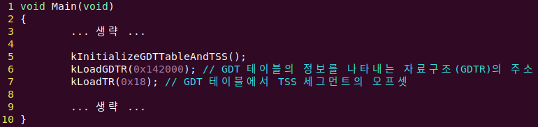 작성한 함수들을 호출하여 프로세서에 GDT 테이블을 갱신하고 TSS 세그먼트를 프로세서에 로드합니다.