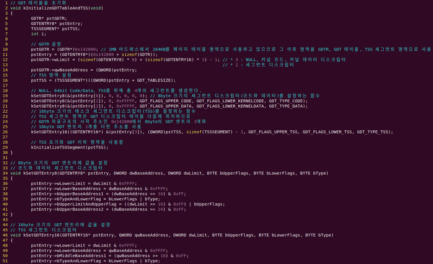 C 코드를 사용하여 구조체와 매크로 그리고 함수만 잘 정의하면 코드, 데이터 디스크립터, TSS 디스크립터까지 전부 처리할 수 있습니다.