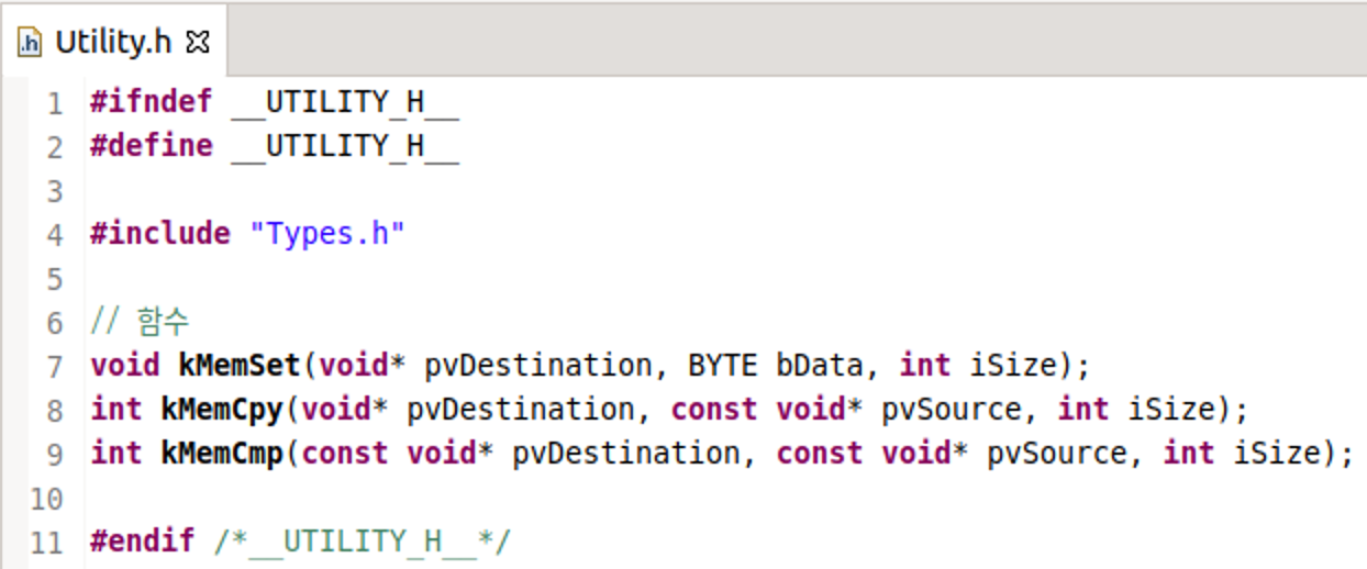 아래의 코드는 유틸리티 파일의 내용이고, kMemSet(), kMemCpy(), kMemCmp() 함수가 포함되어 있습니다.