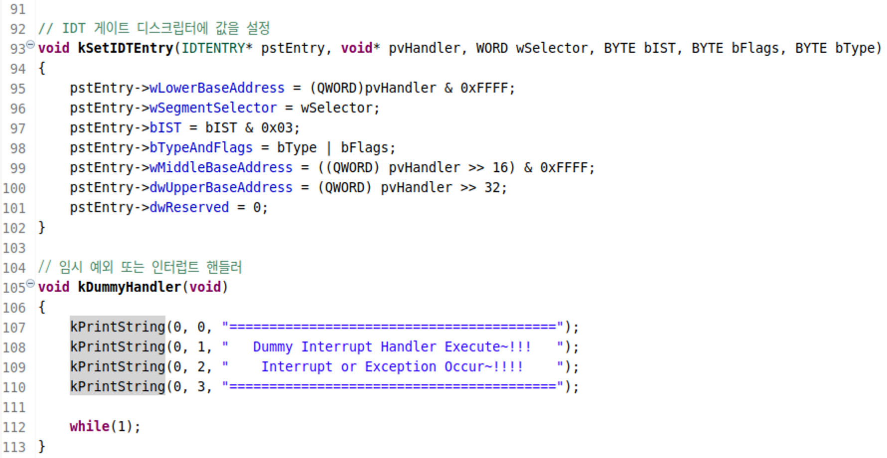 이러한 특징을 이용하여 키를 입력받는 while() 루프 안에 숫자 0 키가 입력되면 임시 변수를 0으로 나누어 예외가 발생하도록 하였으며, 만약 IDT 테이블이 정상적으로 생성되고 프로세서에 로드 되었다면, 임시 핸들러(kDummyHandler() 함수)가 호출되고 커널이 정지할 것입니다.