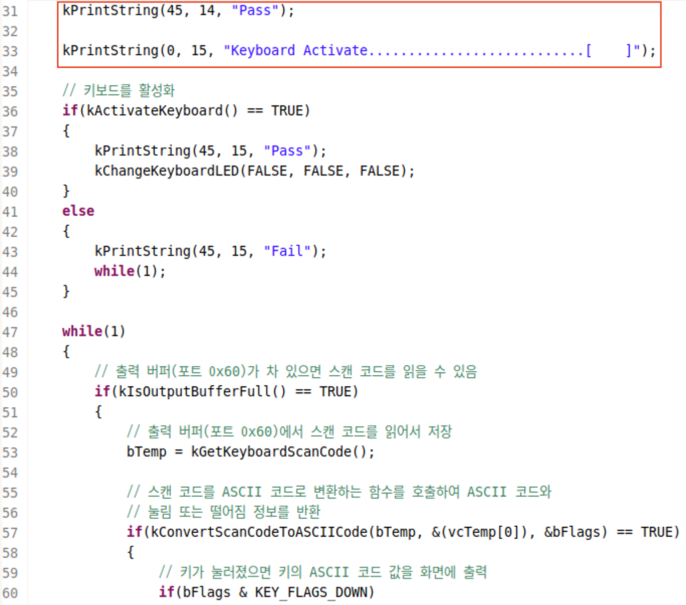 C 언어 커널 엔트리 포인트는 이전의 코드와 대부분이 같으므로 수정된 부분 위주로 나타냈습니다.
