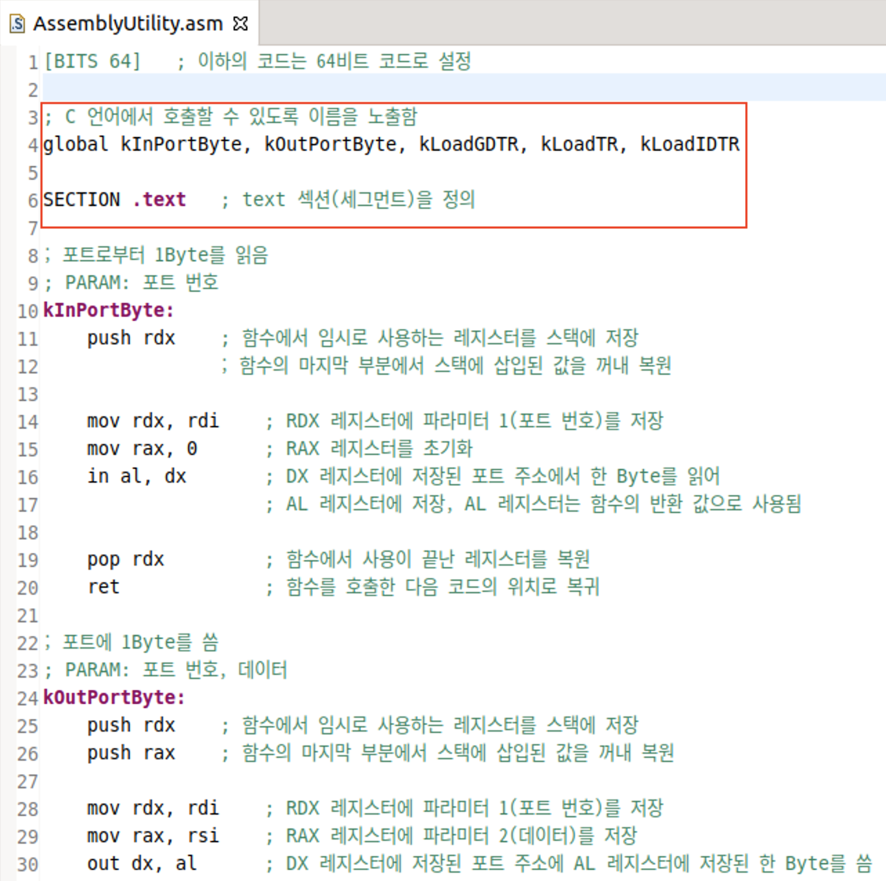 아래의 코드는 어셈블리어 유틸리티 파일의 내용 중에서 수전된 부분을 위주로 나타낸 것입니다.