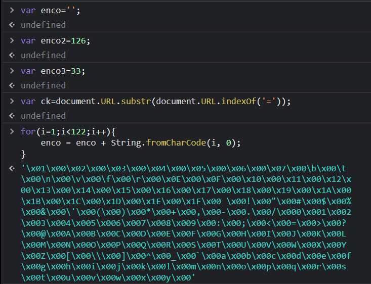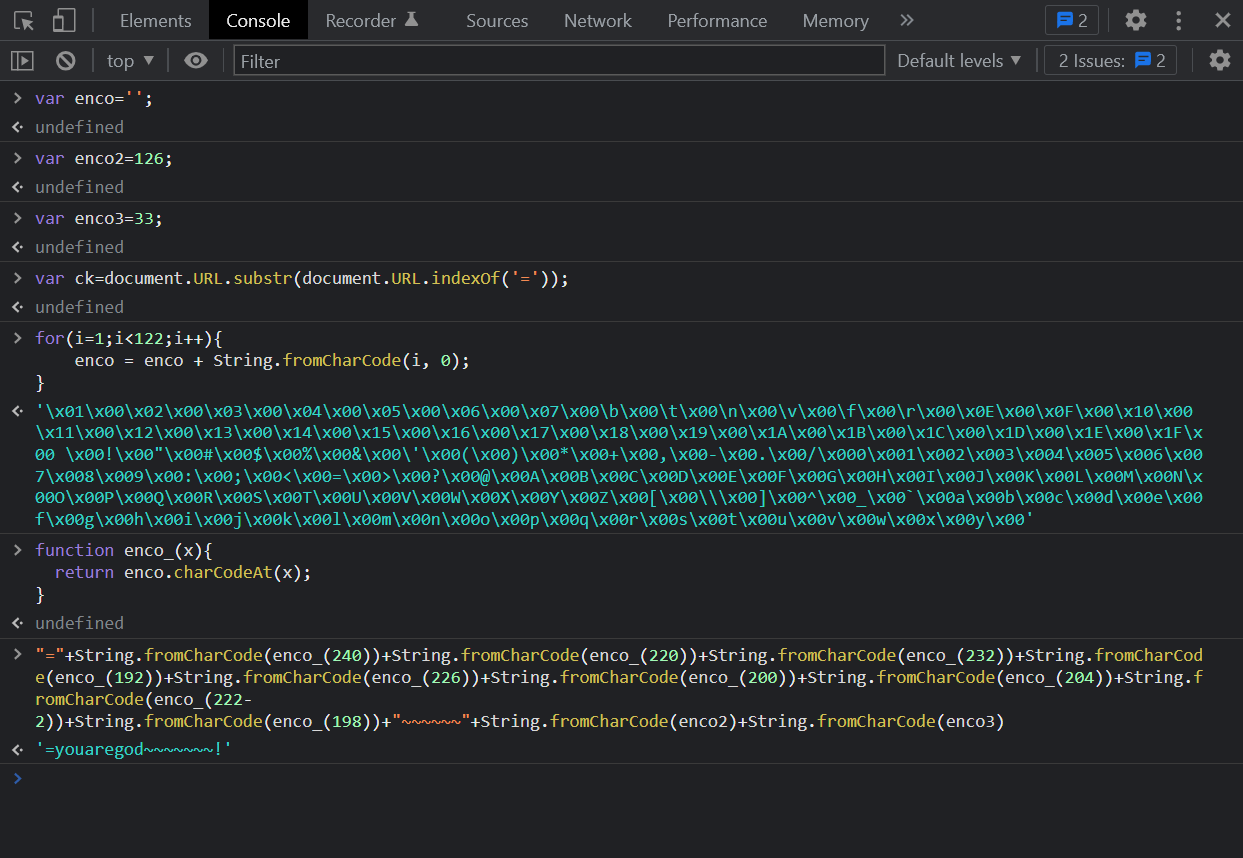 if(ck=="="+String.fromCharCode(enco_(240))+String.fromCharCode(enco_(220))+String.fromCharCode(enco_(232))+String.fromCharCode(enco_(192))+String.fromCharCode(enco_(226))+String.fromCharCode(enco_(200))+String.fromCharCode(enco_(204))+String.fromCharCode(enco_(222-2))+String.fromCharCode(enco_(198))+"~~~~~~"+String.fromCharCode(enco2)+String.fromCharCode(enco3)){