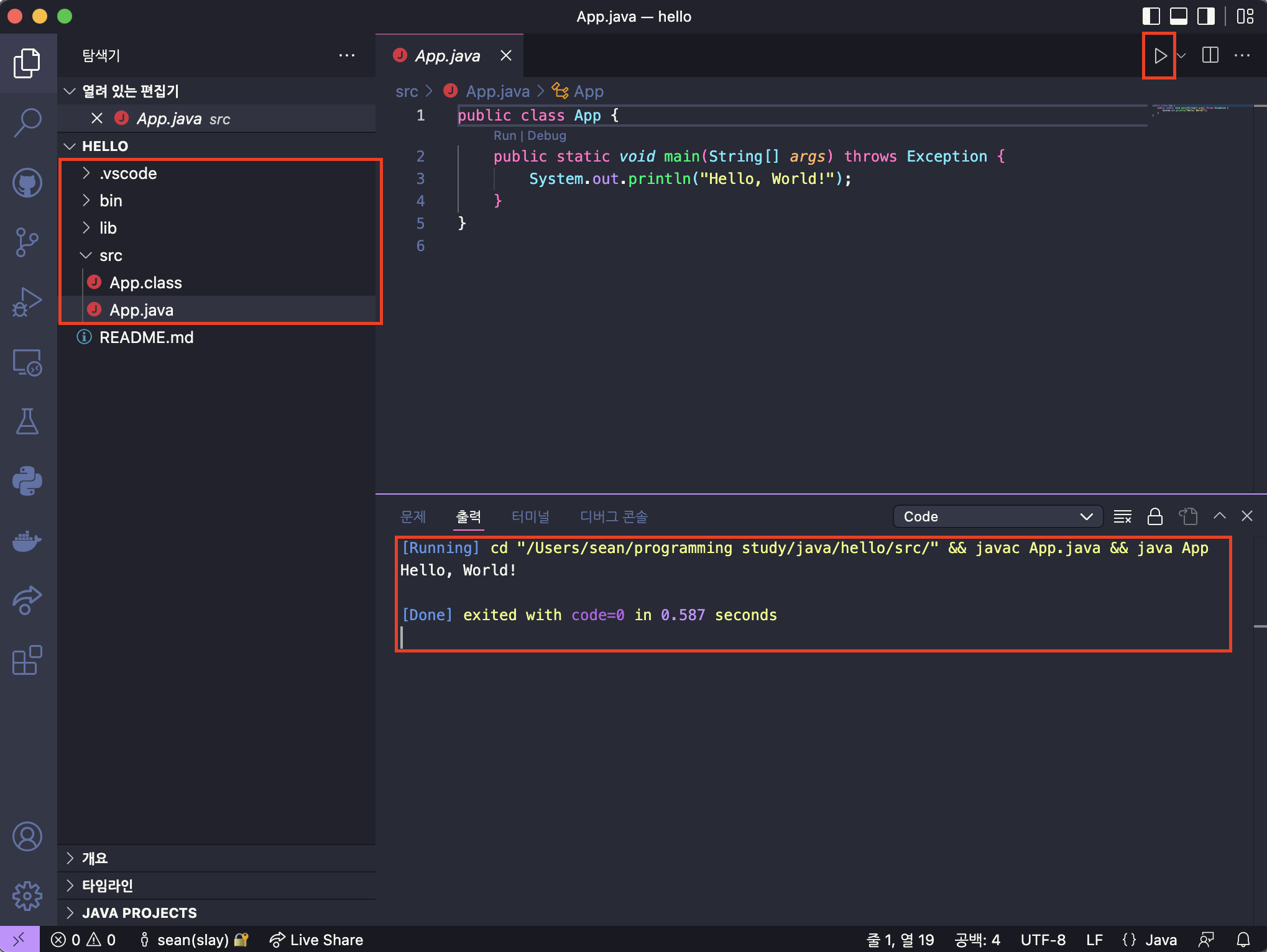 오른쪽 위의 화살표 아이콘을 눌러 실행했을 때 .class 확장자 파일이 생성되고 정상적으로 실행이 된다면 환경 셋팅이 완료된 것이다.