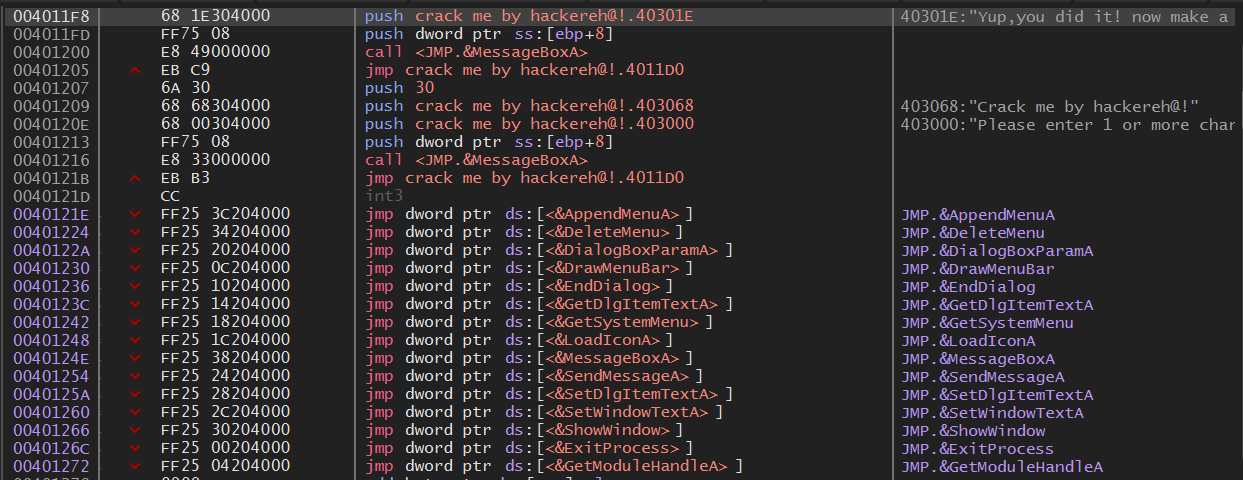 4011F8 주소에 “Yup, You did it! now make a tutorial:)!”가 보이고 그 밑에는 401207 주소에 “Please enter 1 or more chars!” 라는 문자열이 있다.
