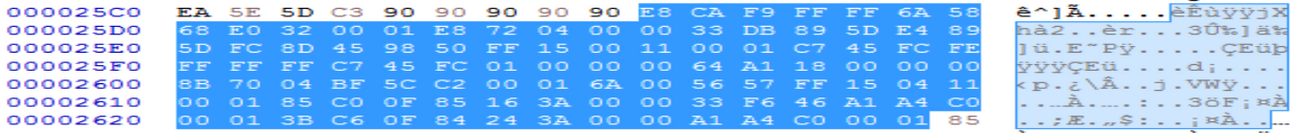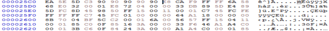 call 명령들의 opcode를 보면 프로세스 메모리 주소가 리틀엔디언 방식으로 하드코딩되어 있다.