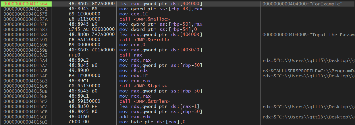 rcx에 사용자가 입력한 패스워드 값, rdx에 지정된 값을 넣고 시작하여 각 문자열이 서로 일치한지 검사한다.