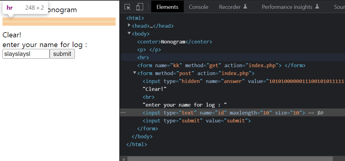 그리고 value로 이전에 보았던 이진수가 적혀져 있는데, 이 element의 name이 answer인 것으로 보아 이 element를 이용해 답을 찾는 것 같다.
