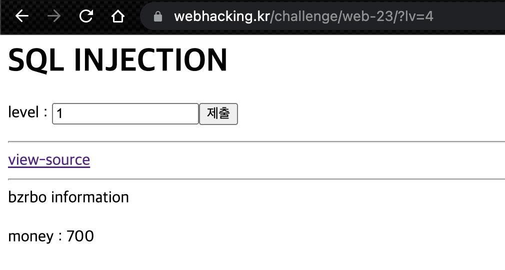 그리고 lv의 값에 특정 문자가 포함되어 있으면 종료하고, 포함되어 있지 않으면 SQL 쿼리문의 조건절에 내가 입력한 값을 포함한다.
