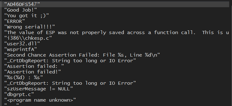입력된 Serial 값과 "AD46DFS547"을 비교하여 같지 않으면 4010A3 주소로 점프하여 "ERROR", "Wrong serial!!!" 문자열이 뜨고