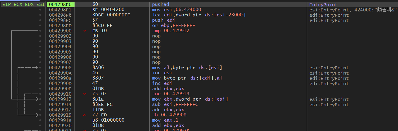 popad 명령어는 찾았지만, 바로 뒤에 나오는 EP 코드로 가는 점프문이 없다.