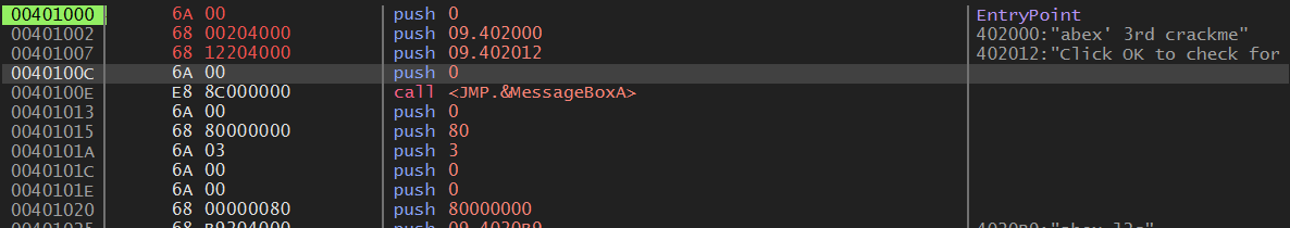 위의 사진을 보면 MessageBoxA() 함수를 호출하는데 MessageBoxA() 함수의 인자들을 스택에 넣은 것이다.