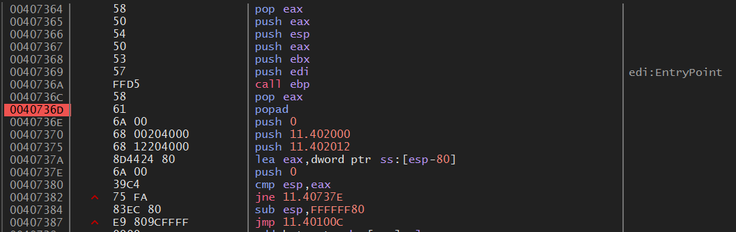디버거로 열면 위와 같은데 popad 명령어를 찾는다.