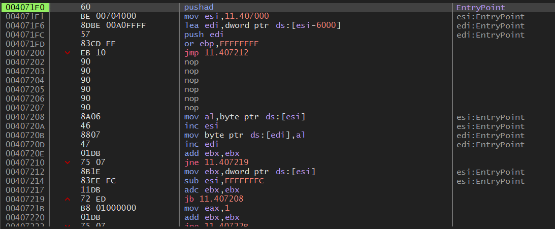 popad 명령어는 40736D 주소에 있는데, popad와 jmp 문 사이가 StolenByte이다.