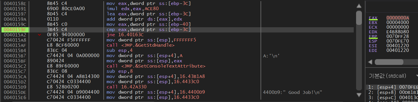 "Good Job" 문자열이 출력되는 부분에서 스크롤을 조금 위로 올리면 40159F 주소에 cmp 명령어가 있다.