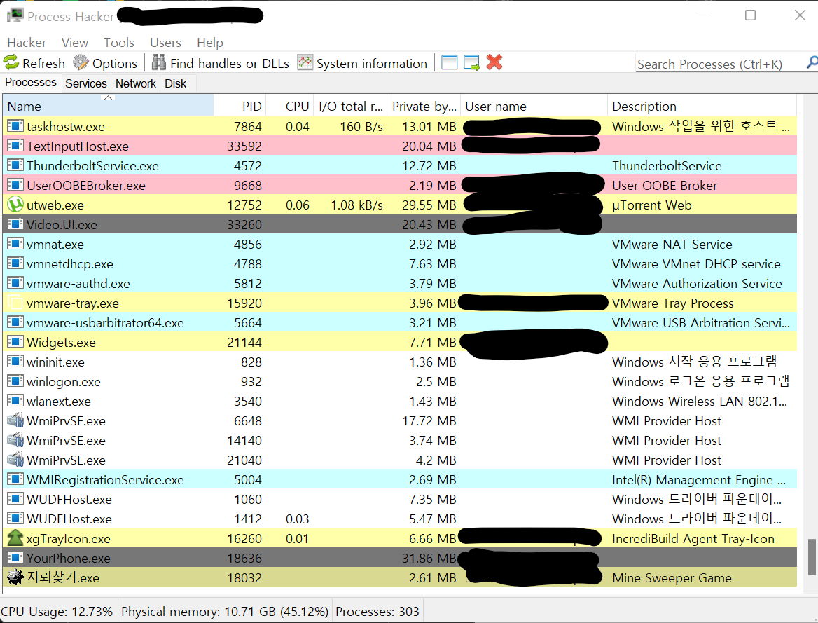 그 다음 Process Hacker을 실행해 지뢰찾기.exe 프로세스의 PID를 확인해보면 위의 사진에서와 같이 18032이다.