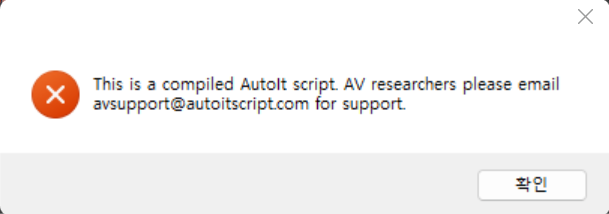 4338DE 주소는 "This is a compiled AutoIt script. AV researchers please email avsupport@autoitscript.com for support." 메시지 창을 띄우는 부분이다.