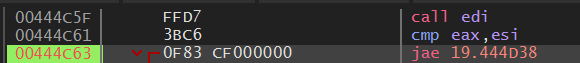 eax의 값은 1A615A6이고, esi의 값은 1A5E6A7이며 EAX가 더 크기 때문에 444C63 주소의 조건 분기는 성립되어 444D38로 점프한다.