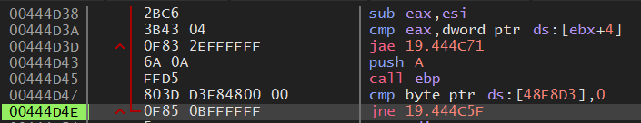 eax의 값에서 esi의 값을 뺀 후 eax의 값이 ebx+4 주소에 있는 값보다 이상이면 444C71 주소로 점프하고, 작으면 스택에 A라는 값을 넣고 ebp에 담긴 함수를 호출한 뒤 48E8D3 주소의 값과 0을 비교후 다르면 444C5F 주소로 점프한다.