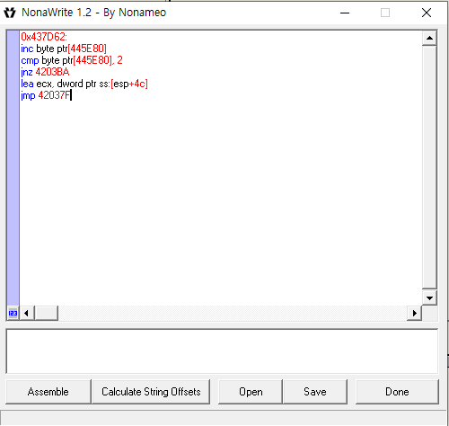 NonaWrite 플러그인을 굳이 이용해야 하는 건 아니지만, 그냥 0x437D62 주소부터 한줄 한 줄 입력하기 귀찮아서이다.