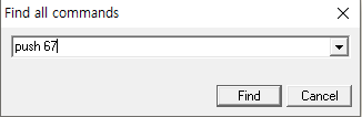 디스어셈블리 창에서 우클릭 -> Search for -> All commands -> push 67 입력 -> find