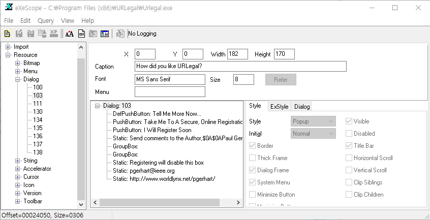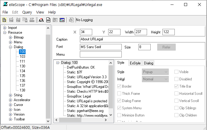exescope 프로그램에서 설치된 URLegal.exe 파일을 열면 읽기 모드로 열리는데, Resource -> Dialog에 가보면 위와 같이 100, 103, 111, 130, 134, 135, 136, 137, 138이 있다.