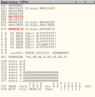401220 주소에 BP를 걸고 Ctrl + F2 키를 눌러 재실행 한 후 F9 키를 누른다.