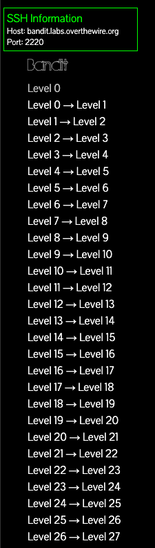 level0부터 쭉 있는데 level 0에서는 그저 ssh에 접속하라는 것과 유저 이름과 패스워드가 bandit0과 bandit0이라는 것만 알려주는데