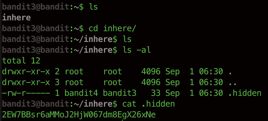 bandit3 password : aBZ0W5EmUfAf7kHTQeOwd8bauFJ2lAiG