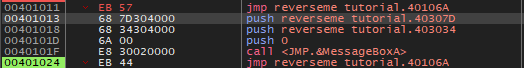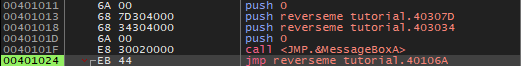 MessageBoxA() 함수를 호출 후 40106A 주소로 점프하기 때문에