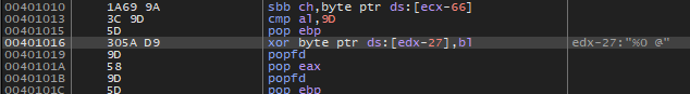 401314 주소부터 40131D 주소까지가 401000 주소 ~ 401218 주소에 있는 암호화 된 바이트 코드를 대상으로 xor 연산으로 복호화 하는 루프이고, 이 루프를 Decrypting 루프라고 한다.