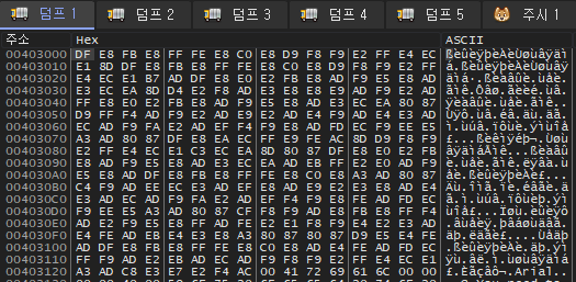 401320 주소의 함수에서 암호화 루프를 거치기 전에는 403000 주소 ~ 403128 주소에서 읽을 수 있는 문자열들이 보이지만